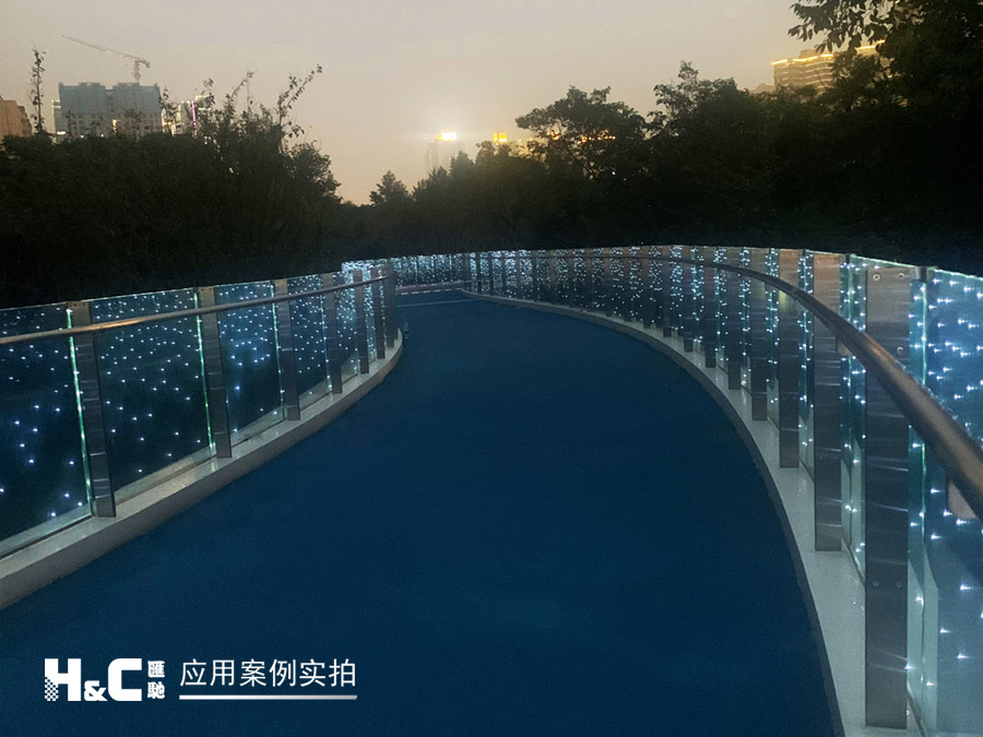 “絲路云錦”有三條跨線橋,外形設(shè)計靈感來源于“竹葉輕”,其中一座橋上的護(hù)欄采用了匯馳LED發(fā)光玻璃。它將單個LED點光源封裝在兩片鋼化安全玻璃中間,并使用隱線工藝,不細(xì)看基本看不到線路,這樣既保持了玻璃的透明特性,又可以控制呈現(xiàn)光電效果,創(chuàng)造出美妙的空間,起到獨特的裝飾和調(diào)節(jié)場景氛圍的作用。