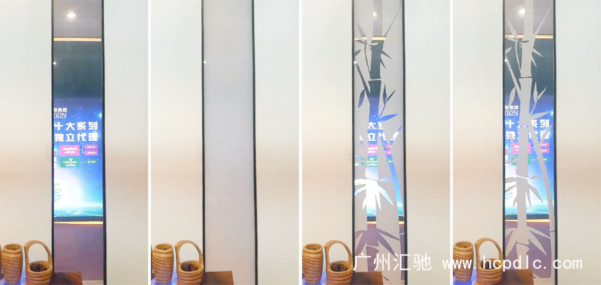 玻璃還是霧化玻璃,只是在原霧化玻璃的基礎(chǔ)上,設(shè)計出透明或霧化的圖案區(qū)域,再通電控制需要顯示的區(qū)域,玻璃就可以有“透明——霧化——顯示圖案”三種基本狀態(tài)了。圖案可以是單個圖案,也可以是多種圖案組合,圖案可以靜止,也可以變化,這樣就會有多種展現(xiàn)效果了。