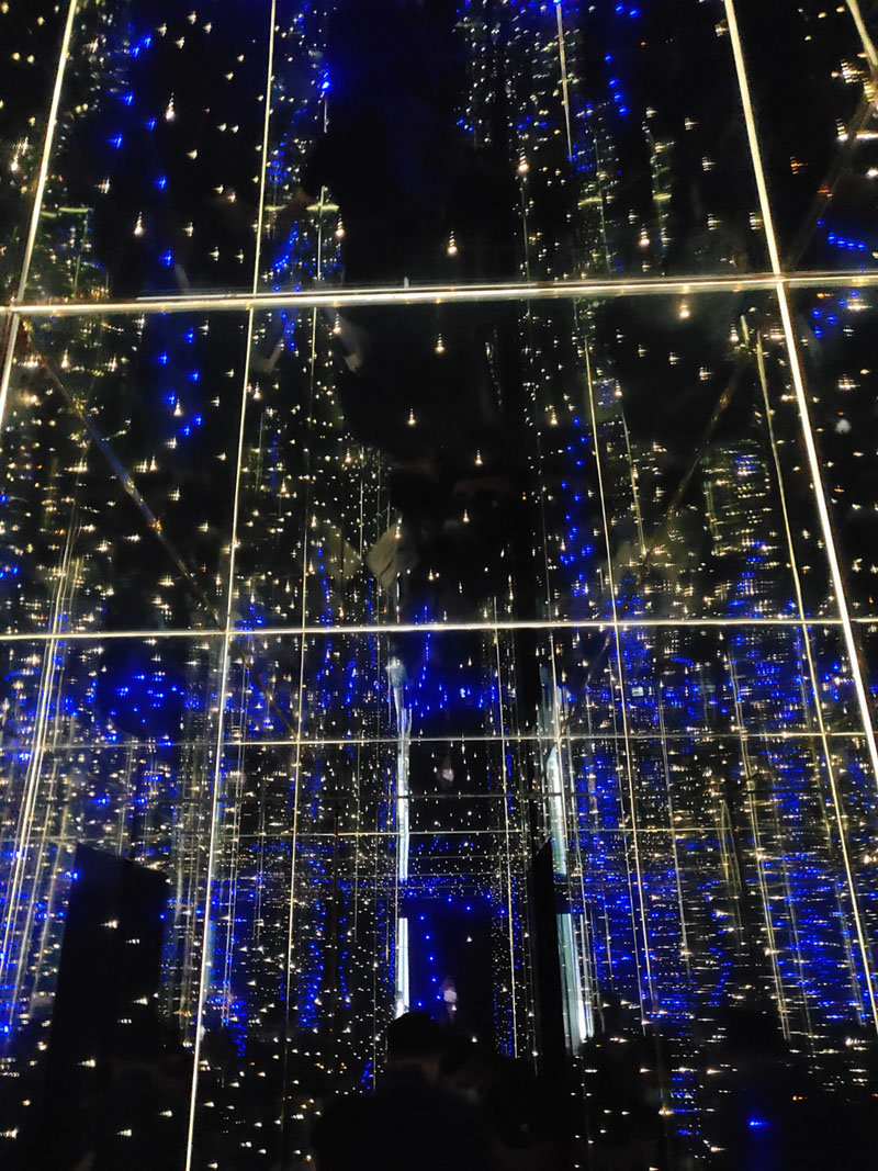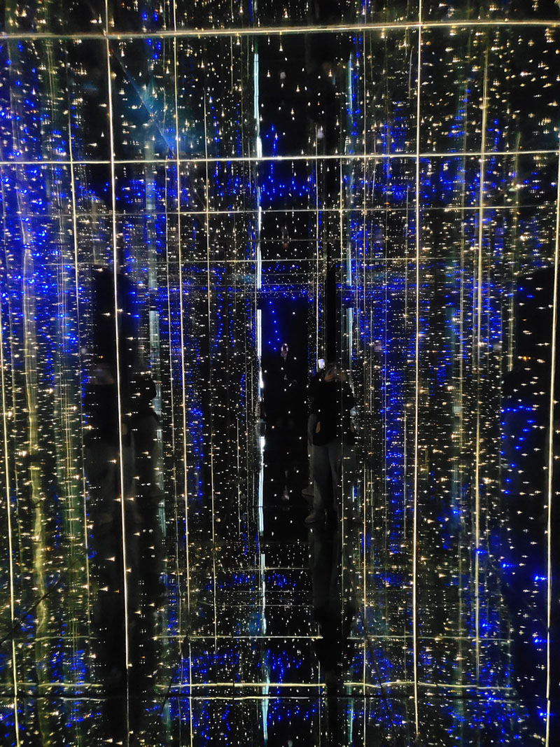 材質(zhì)應(yīng)用說明:LED鏡面玻璃為本作品的主材,利用鏡面之間的無限反射塑造N次方的疊加空間,同時(shí)利用LED點(diǎn)狀光源玻璃應(yīng)用造出無盡星空宇宙,置身其中猶如隔世。