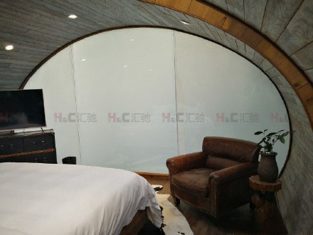 空間雖小但視感良好,打開(kāi)暖色的燈光,舒適感瞬間提升。屋子的盡頭采用調(diào)光玻璃作為隔斷,它擁有透明玻璃和霧化玻璃的雙重特性,可自由切換狀態(tài)。白天切換到透明狀態(tài),盡情欣賞外界景色,感受外界變化;晚上切換到霧化狀態(tài),隔開(kāi)外界影響,盡情享受舒適睡眠。