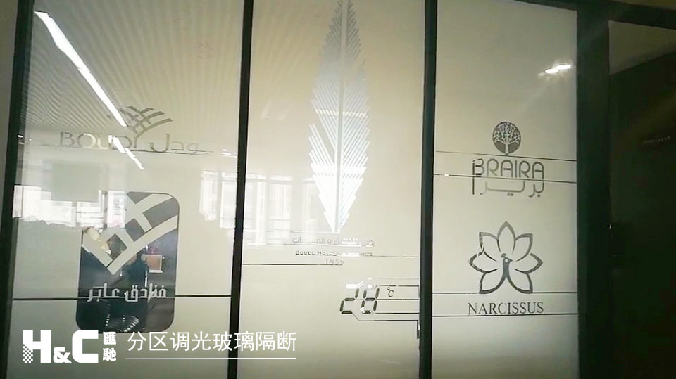 圖為雕繪了文字和圖案的分區(qū)調(diào)光玻璃,用于室內(nèi)隔斷,把公司的品牌LOGO印在上面,表現(xiàn)出濃濃的創(chuàng)意感和科技感。通電的區(qū)域變透明,即顯示圖案;不通電的區(qū)域霧化,即不顯示圖案。