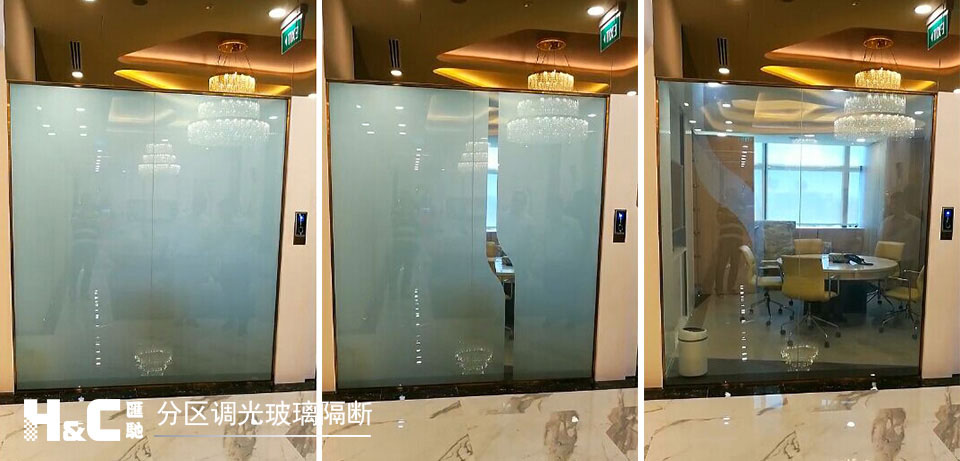 分區(qū)調(diào)光玻璃既能像普通調(diào)光玻璃一樣調(diào)節(jié)一整片玻璃的透明或霧化效果,還能調(diào)節(jié)玻璃上顯示的透明或霧化圖案,這正是它的魅力所在。