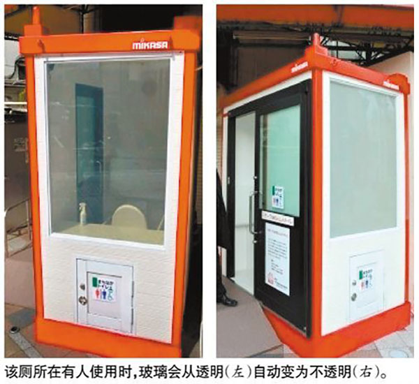 在日本大分市中心商業(yè)街街頭有一個應用霧化玻璃的公廁(如下圖)。當廁所里面沒人時,從外面看一覽無余,有人進入后,廁所里的傳感器就會感應,讓玻璃變霧化。