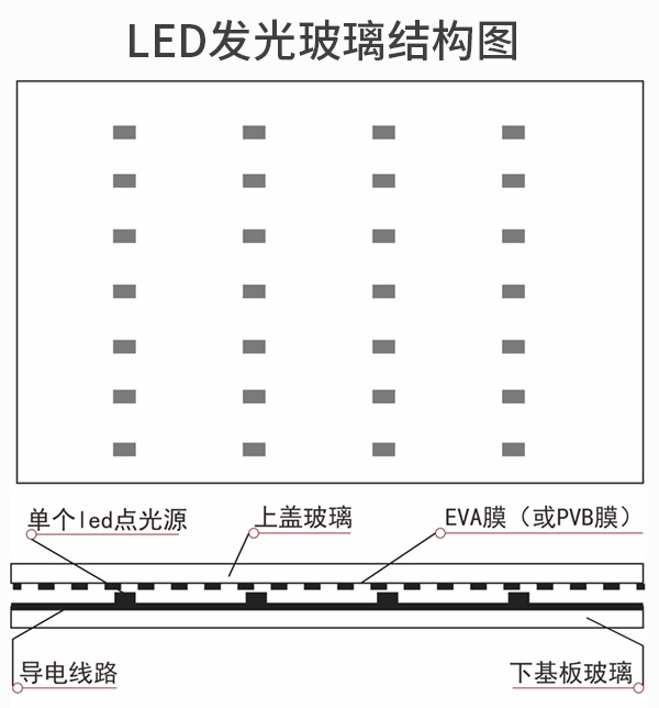 LED發(fā)光玻璃是一種具有多重?cái)U(kuò)展性的高科技建材,它是利用特殊夾膠工藝,將單個(gè)LED點(diǎn)光源以陣列形式封裝在兩片鋼化玻璃中間,形成安全夾層結(jié)構(gòu)的LED平板發(fā)光玻璃產(chǎn)品。